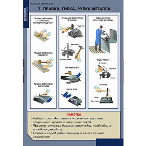 Общие правила поведения в учебных мастерских. Рабочее место учащегося. Инструменты для ручной обработки. Графическое изображение деталей. Технологическая карта. Разметка заготовок. Правка, гибка, рубка металла. Разрезание, опиливание металла. Резьба, её виды. Сверление, точение. Сборка деталей, отделка изделий.